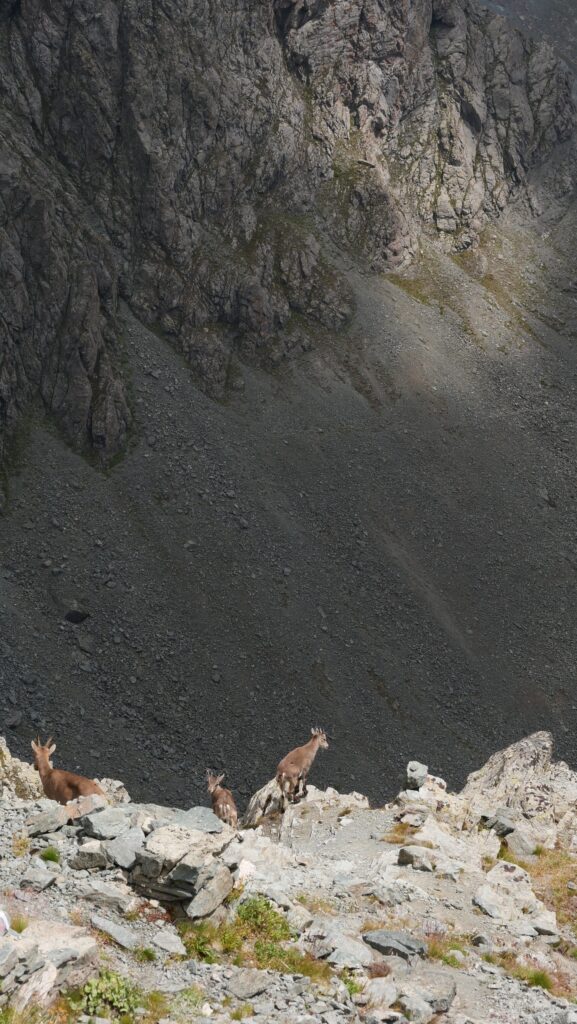 Bien nous en prend : tout là-haut, une famille de chamois attend le moment calme pour traverser, comme à un passage piéton pour caprins polis. Nous prenons l’option pique-nique côté Italie, avec le regard qui se perd loin, très loin.