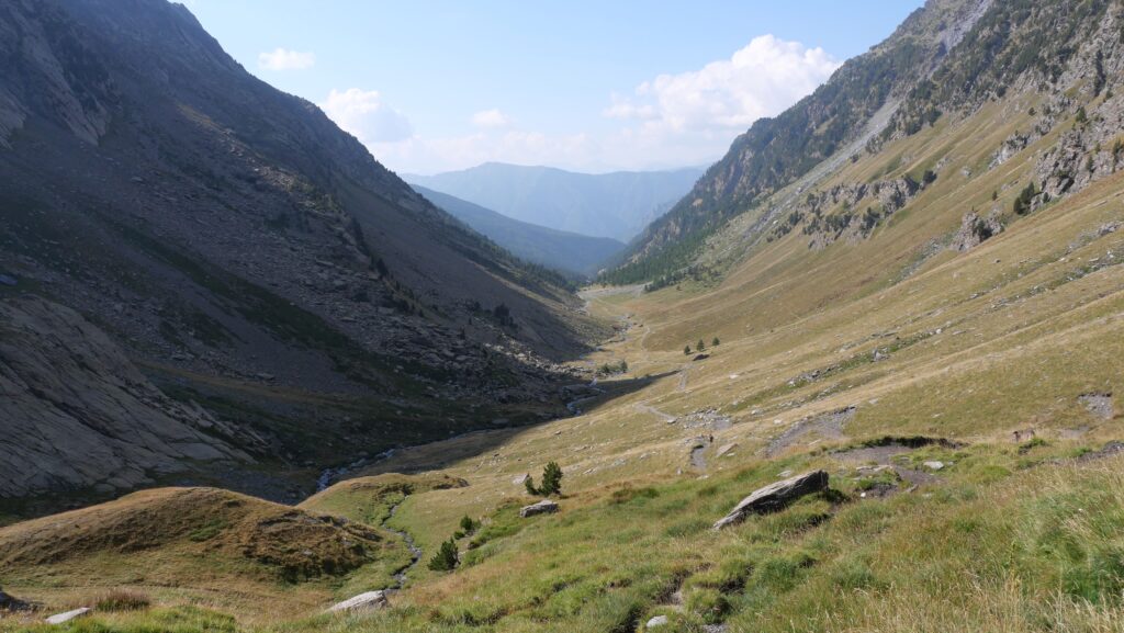 On remonte tranquillement la vallée vers le Col de Valante. Nous repassons la frontière, et basculons sur un grand pierrier français d’anthologie. On choisit de le descendre avant de pique-niquer pour avoir le plus costaud derrière nous. La pause est rapide au bord d’un petit lac : le vent est frisquet, on ne traîne pas.